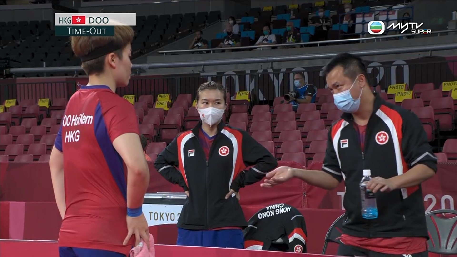 東京奧運2020 轉播鏡頭捕捉到港乒男隊主教練李靜在杜凱琹打到第四局單打項目時,場外指導杜凱琹。