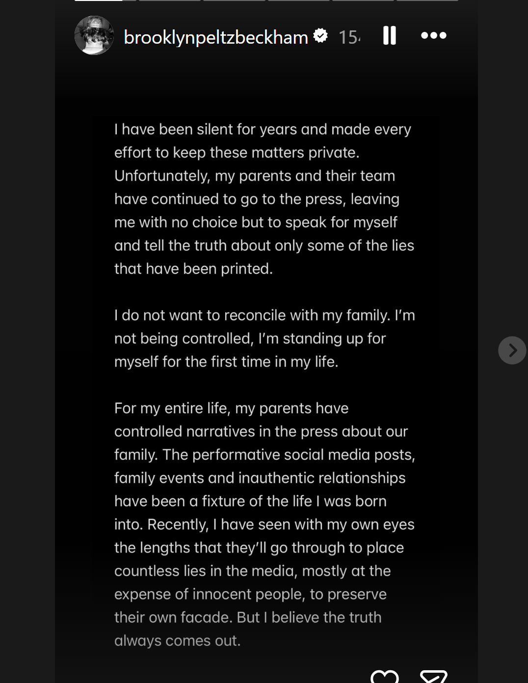 Brooklyn表示,與Nicola交往後,長年困擾他的焦慮問題才獲得緩解。他強調,自己並非受到妻子影響,而是長期活在父母的掌控之下。他明確表示:「我不想與家人和解,我不再被控制,這是我人生中第一次為自己站出來。」