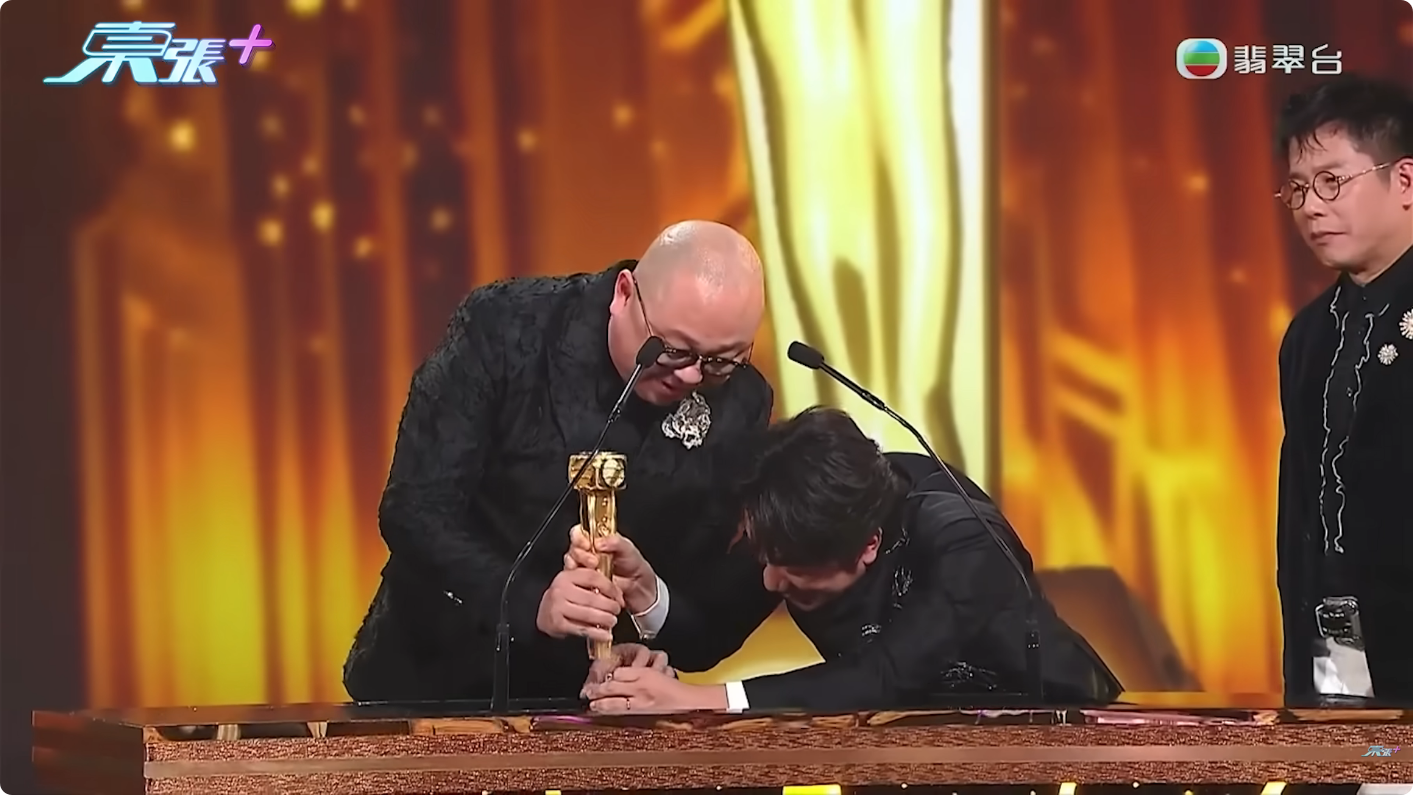 然而,高潮並未結束。在發表得獎感言時,阿Bob疑似太過興奮,竟不小心將獎座弄斷,場面一度尷尬又搞笑。
