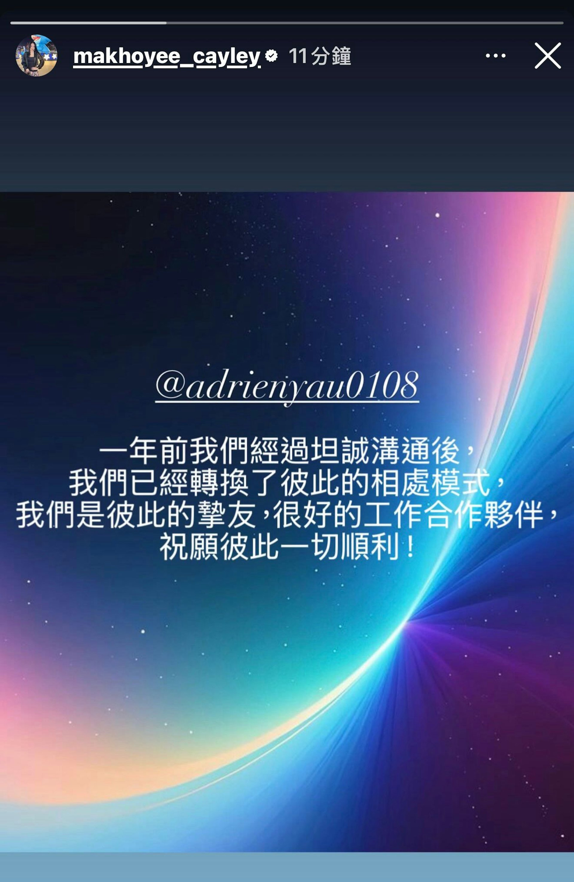 聲明中透露,他們其實早在「一年前」已透過坦誠溝通,將相處模式轉變,現階段定位為「彼此的摯友,很好的工作合作夥伴」,並互相送上祝福。雖然聲明中未直接提及「分手」二字,但關係由戀人降格為摯友及工作夥伴,暗示長跑戀情正式劃上句號。有指他們曾有結婚共識,如今的轉變令人唏噓。