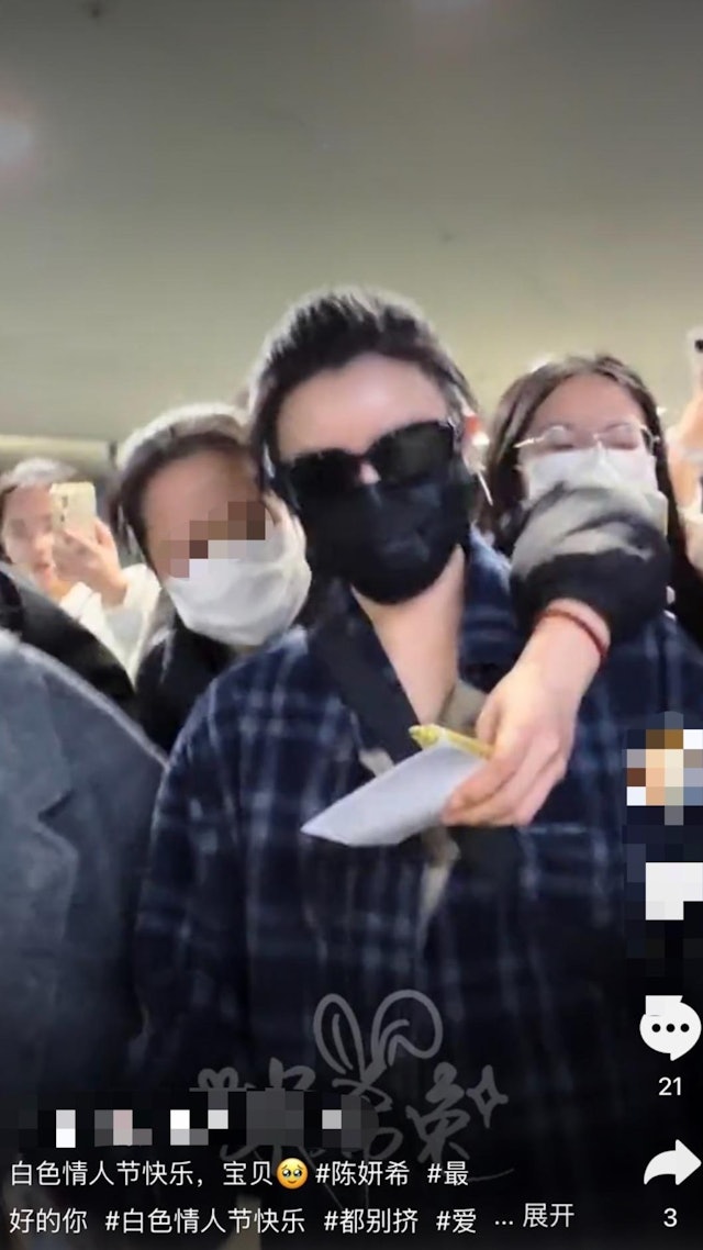 陳妍希近日在上海機場遭遇驚險一幕,一名女粉絲從後熊抱她並鎖喉遞卡片,場面一度混亂。據報導,事件發生於陳妍希離開機場時,該女粉絲突然從後衝上前,緊緊抱住陳妍希,右手臂環住她的脖子,左手則伸到她胸前位置遞上一張卡片,嘴裡不斷說話,行為極度失控。