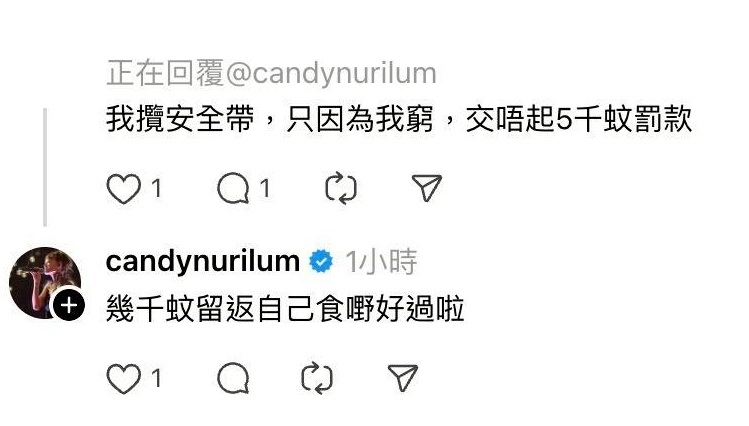 更有網民留言「其實我真係好驚扯出嚟嗰下有小強」,反映執行細節如安全帶清潔、異味、拉扯時尷尬等各種擔憂。網民普遍感同身受,認為法例忽略老人、傷殘人士、孕婦及幼童等特殊群體的使用不便,甚至出現扣帶過程漫長、勒頸、阻礙落車等實際問題,其後她在限時動態上載一張自己佩戴安全帶的黑白照,並配上單字「Stupid」,明顯表達不滿與諷刺。