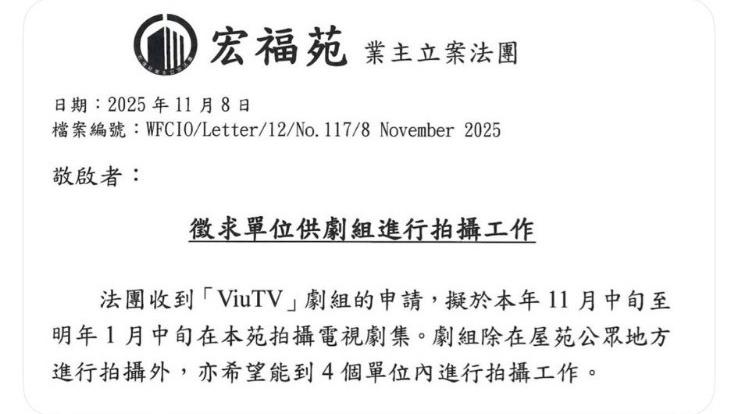 ViuTV新劇《小業主戰線》因拍攝場地引發網絡關注。近日,有網民在社交平台發布一張據稱為「宏福苑大火前最後一張公告」的照片,內容顯示該劇組曾向大埔宏福苑申請,於本年11月中旬至明年1月中旬期間租用屋苑公眾地方及四個單位進行拍攝。這份11月8日發出的通告在宏福苑發生嚴重火災後被翻出,由於劇集主題是講述小業主對抗法團「圍標」的民生故事,時機上的巧合令不少網民感嘆事件「太寫實」、「好諷刺」。