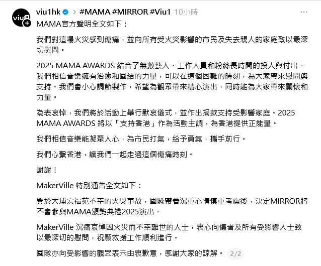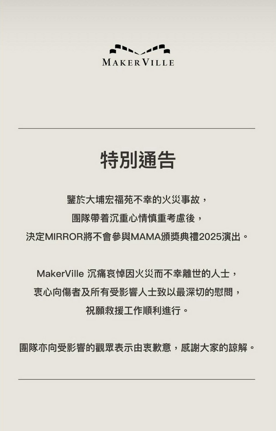 香港男團MIRROR原定在《2025 MAMA AWARDS》擔任表演嘉賓,但鑑於大埔宏福苑發生嚴重五級火災,團隊經過慎重考慮後,於昨日(27日)晚上宣布將缺席本次頒獎典禮演出。