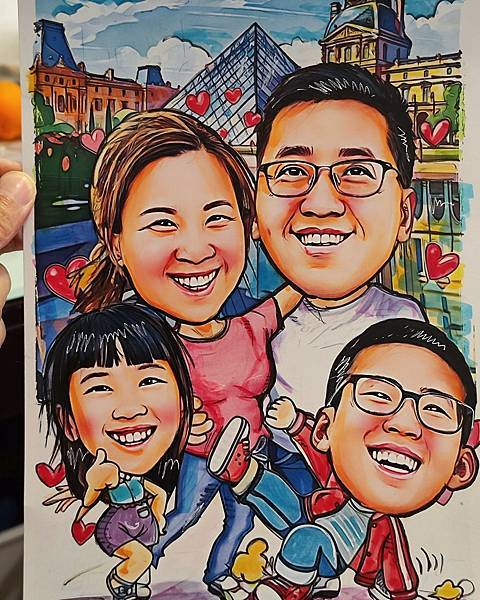 記得有一天,孩子們渴望家中有一張人像畫作增添一些溫馨的元素。爸爸就在網上找到佐老師,分享了很多全家的共同回憶:在法國羅浮宮旁的嬉戲、回憶這趟旅行在裡的歡笑。這些畫面就讓老師豐富了畫作,也讓每一個家庭成員都回到那個歡笑的時刻,每天也會將回憶回到那次開心之旅。
