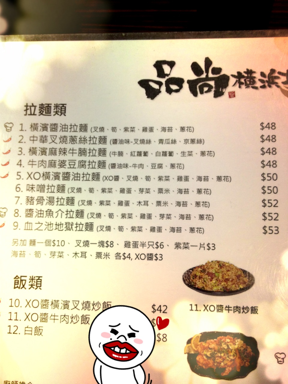 第一次光顧,當然要點最多人推介的橫滨醬油拉麵,不過天氣寒冷,好像吃點辣會暖些~ 結果點了XO橫滨醬油拉麵