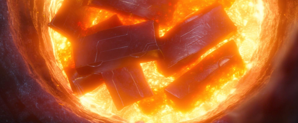 Thanos這把巨型雙刃劍霸氣逼人而且攻守兼備,前者利用它輕易擋下Ironman發射的激光,亦能同時抵抗『雷神之槌』和『風暴毀滅者』的攻擊,美國隊長手上堅固的振金(Vibranium)盾牌面對雙刃劍如怒濤的劈斬時更慘遭砍碎,要知道振金盾牌的堅固程度足以擋下『雷神之槌』的全力一擊,所以這把雙刃劍的物料必定是一種比振金還要堅硬的物料!雖然電影內容沒有提及過雙刃劍的製造過程,但我們亦可以從數部漫威電影去推測雙刃劍的來歷!根據漫威宇宙電影的設定,宇宙間有三種堅固無比的金屬,第一種是先前提及的振,第二種則是亞德曼合金(Adamantium),另外還有一種名為烏魯(Uru)的金屬。在漫威電影中,雷神之槌、無限手套與『風暴毀滅者』都是由矮人族利用烏魯金屬鍛造。重溫《復仇者聯盟2:奧創紀元》的結尾彩蛋,Thanos穿起無限手套,打算由自己收集無限寶石,由此推斷,Thanos本身已擁有一些烏魯金屬(或從矮人處搶奪而來)。在《終局之戰》中,Thanos沒有製造無限手套,反而強迫矮人工匠利用烏魯金屬去鍛造一把強而有力的武器去對抗復仇者,雙刃劍就在此背景下橫空降世。除此之外,闇黑號令(Black Order)成員──亡刃(Corvus Glaive)手上的長矛也是非常堅固,不但能輕易刺穿幻視(Vision)由振金構成的身體,亦能抵擋心靈寶石的激光,由此可見,長矛可能也是由烏魯金屬構成。